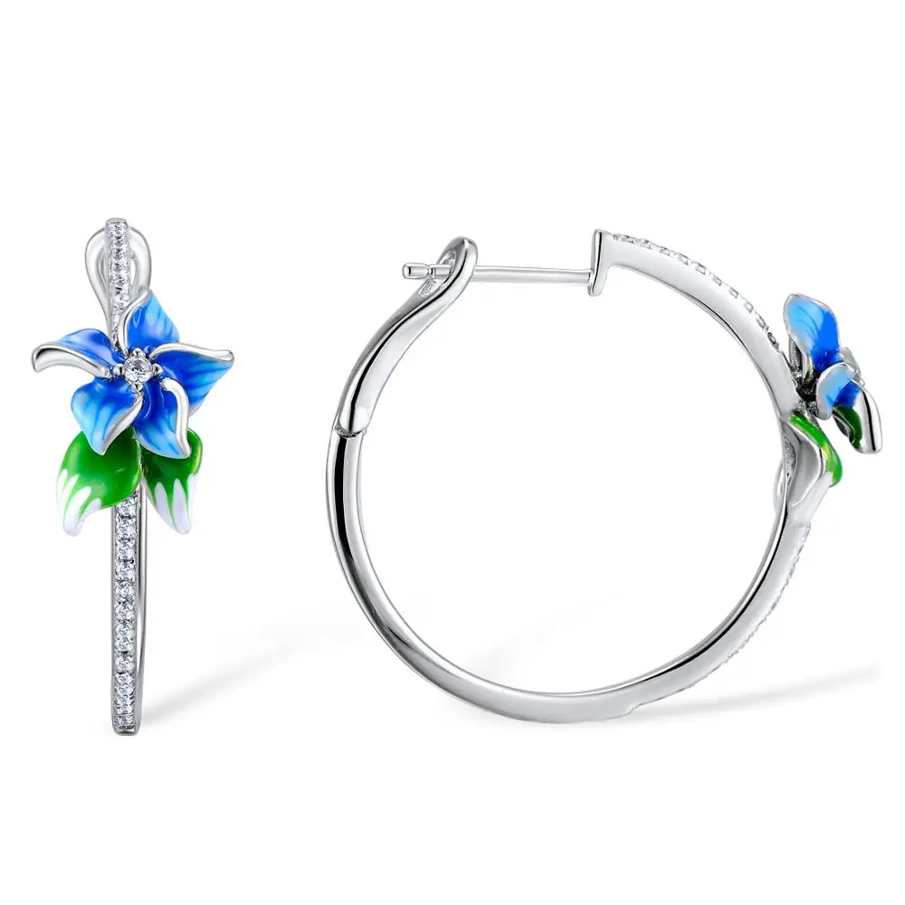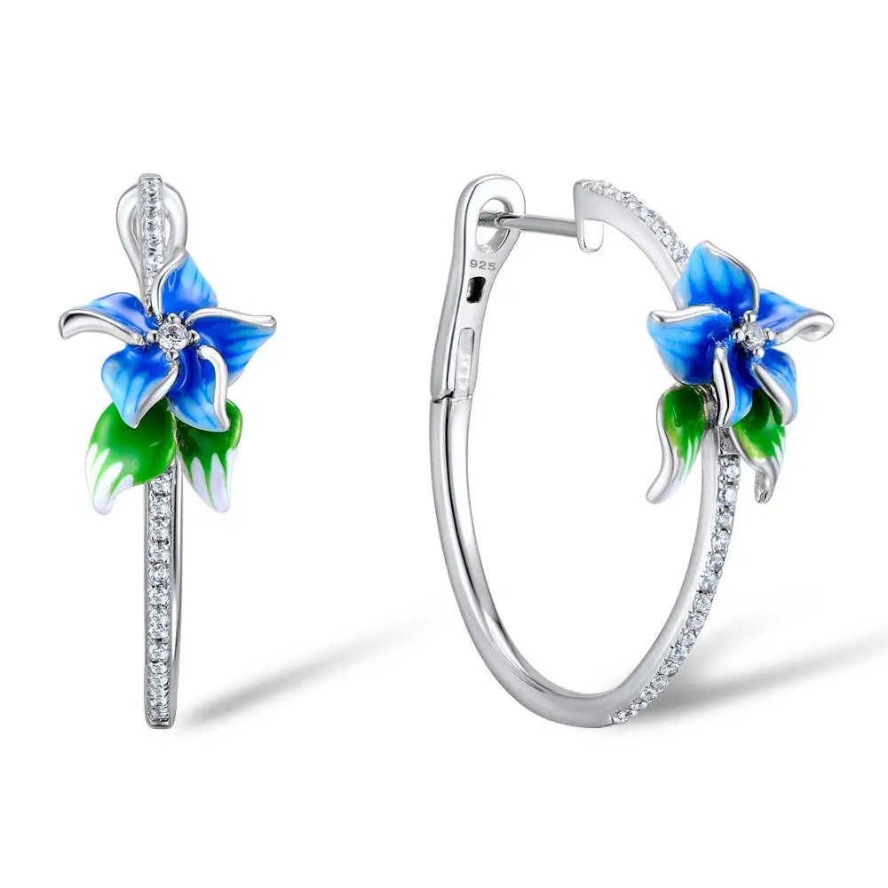 Special Offer SANTUZZA Silver Earrings For Women 925 Sterling Silver Blue Flower Hoop Earrings Silver Cubic Zirconia brincos Jewelry Enamel Discount 49% Today!