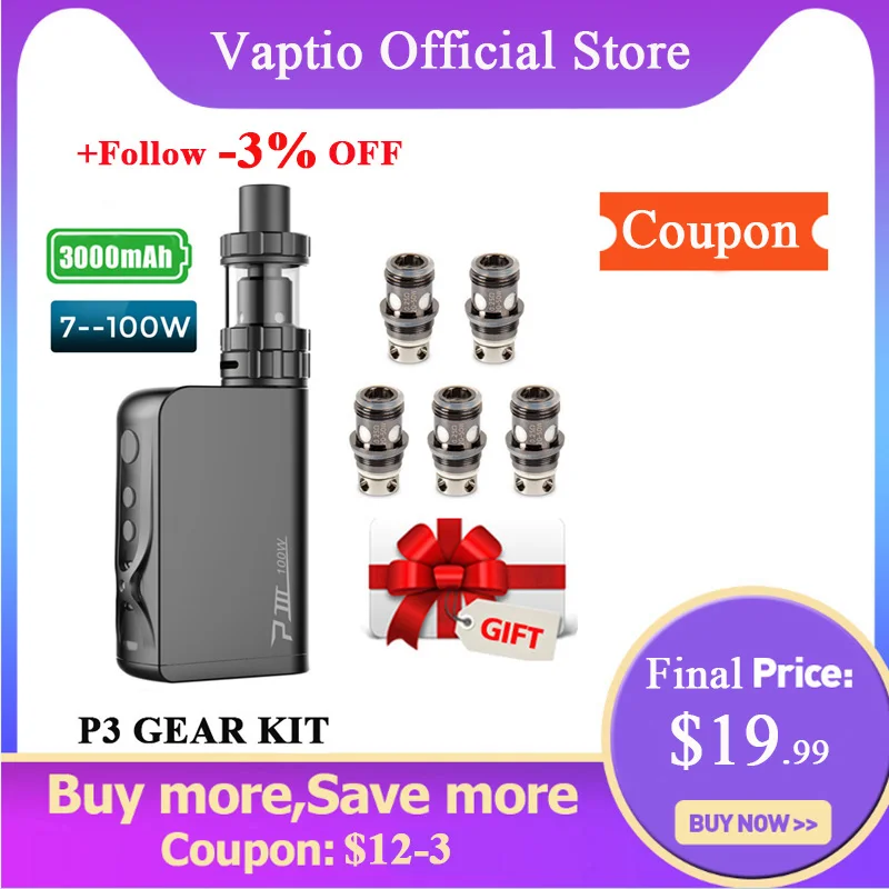 Best . (54% Off) Buy Gift 5pc Coils 3000mAh Vape Mod Original Vaptio P3 GEAR KIT with 100W Built in battery Electront ic Cigarette ki 2.0ml atomizer Cheap Online.