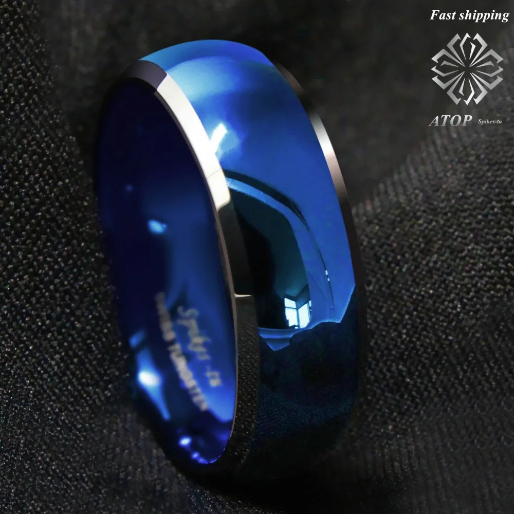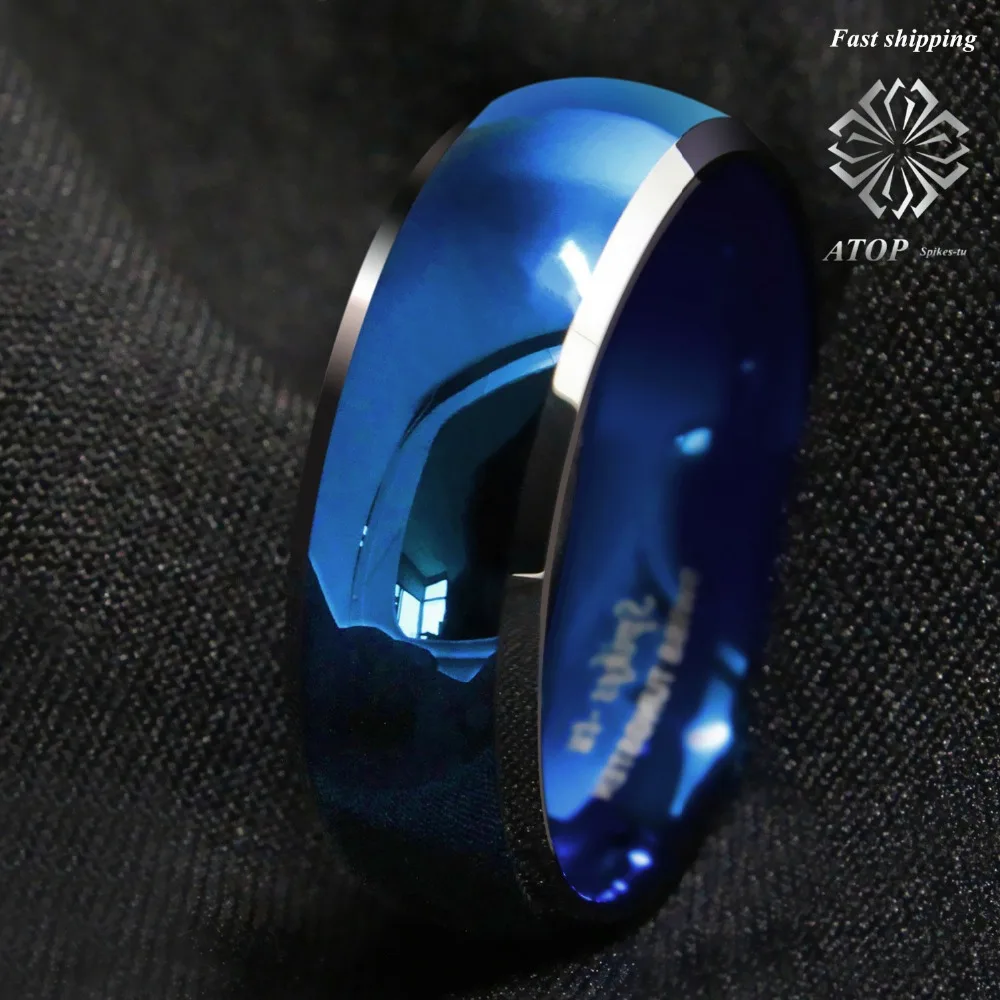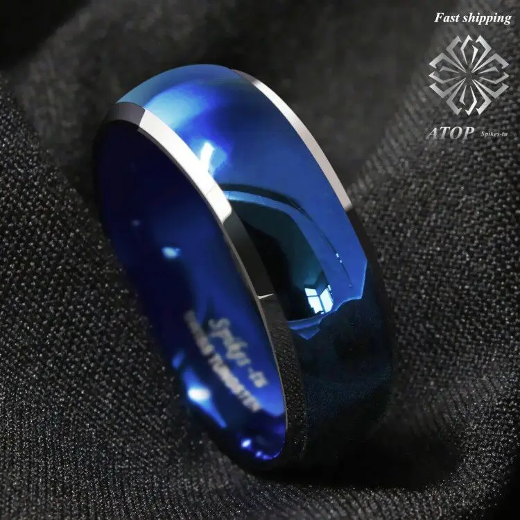 Special Offer 8mm Men s Tungsten ring Blue Domed with Beveled Silver Edges Wedding Rings Free Shipping Discount 0% Today!