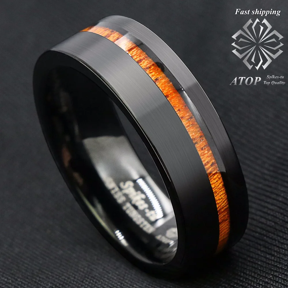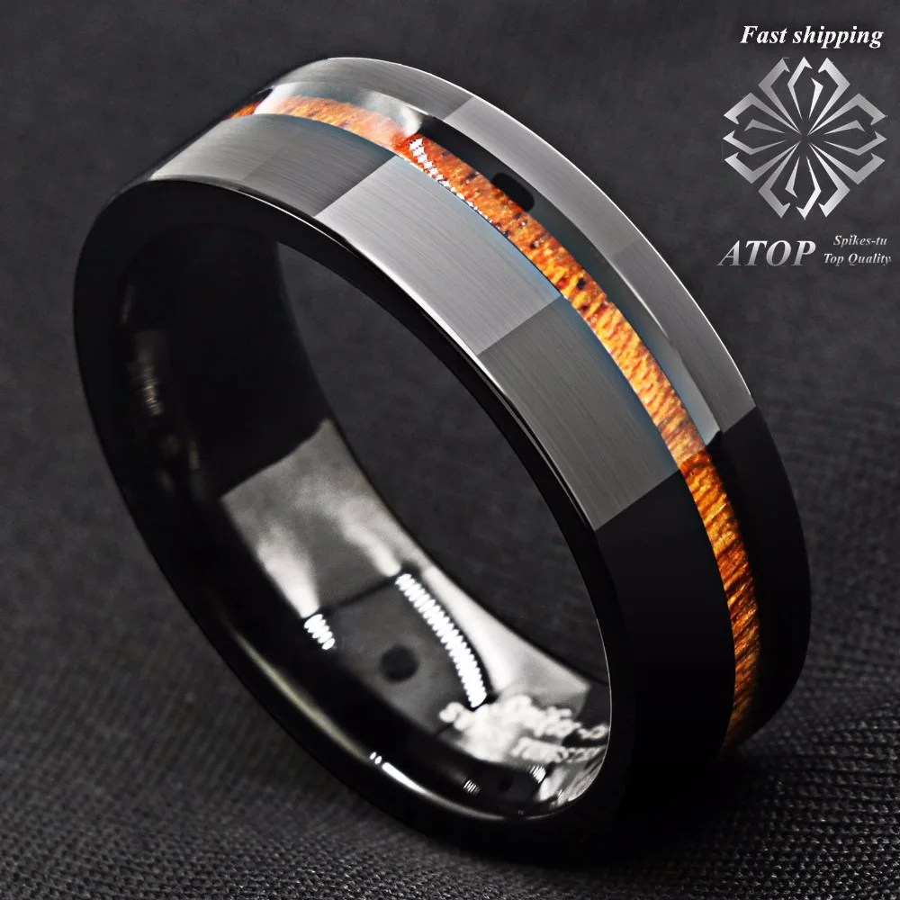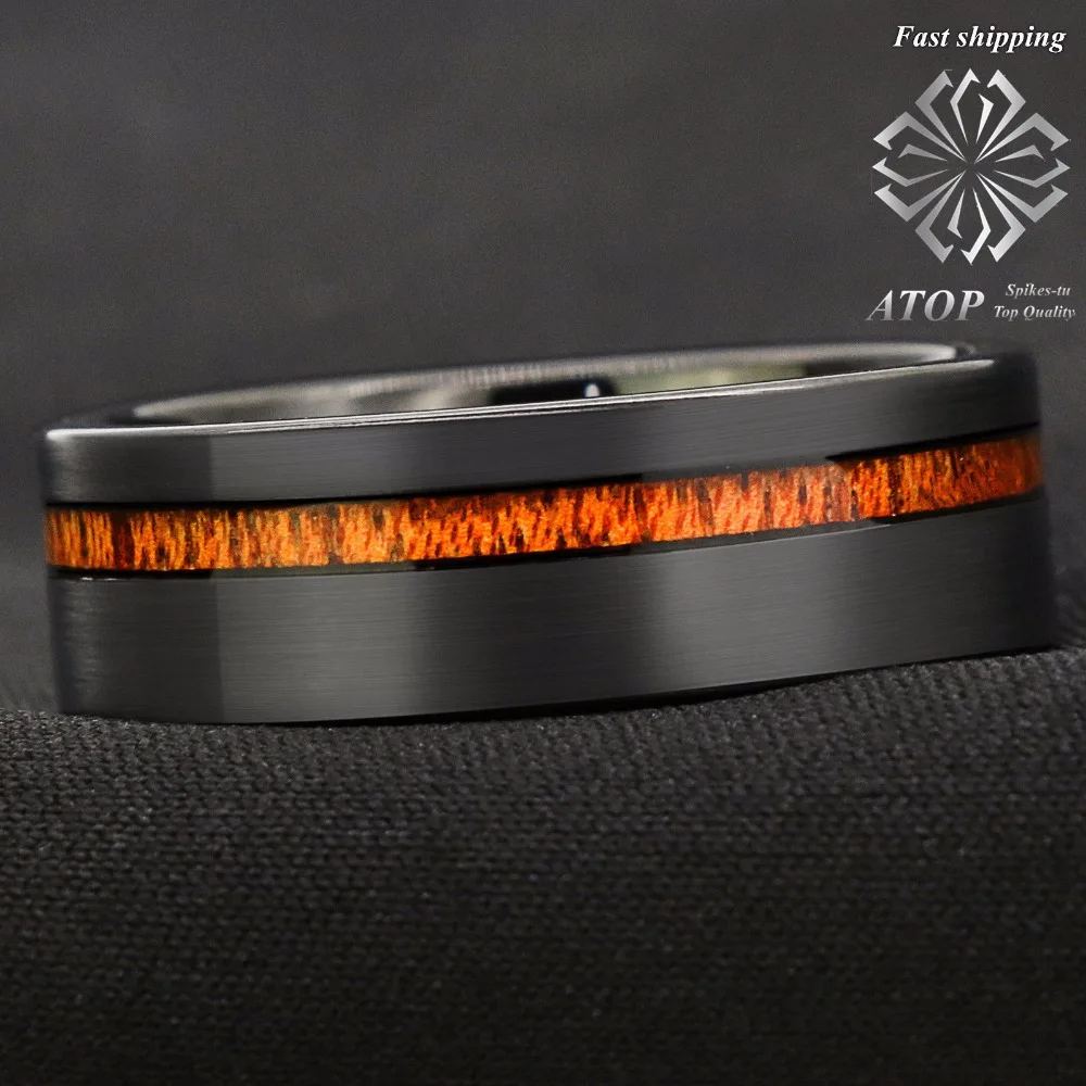 Special Offer 8mm Black Brushed Tungsten Carbide Ring Off Center Koa Wood Wedding Band Ring Discount 0% Today!