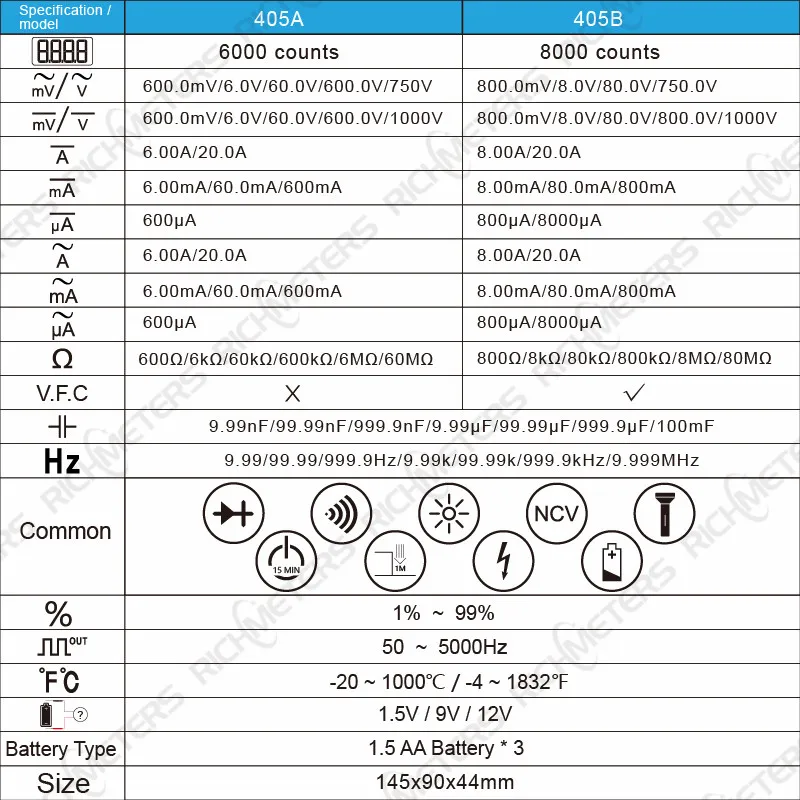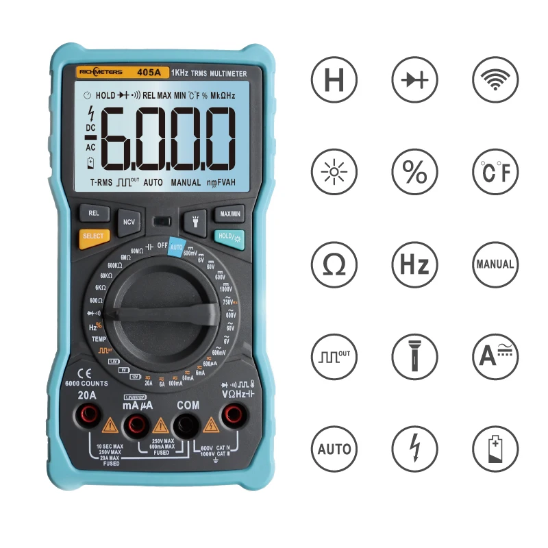 Special Offer RICHMETERS 405A True RMS 20A Digital Multimeter 6000 Counts AC DC Voltage Current Ohm Temperature Auto Manual Square Wave Discount 35% Today!