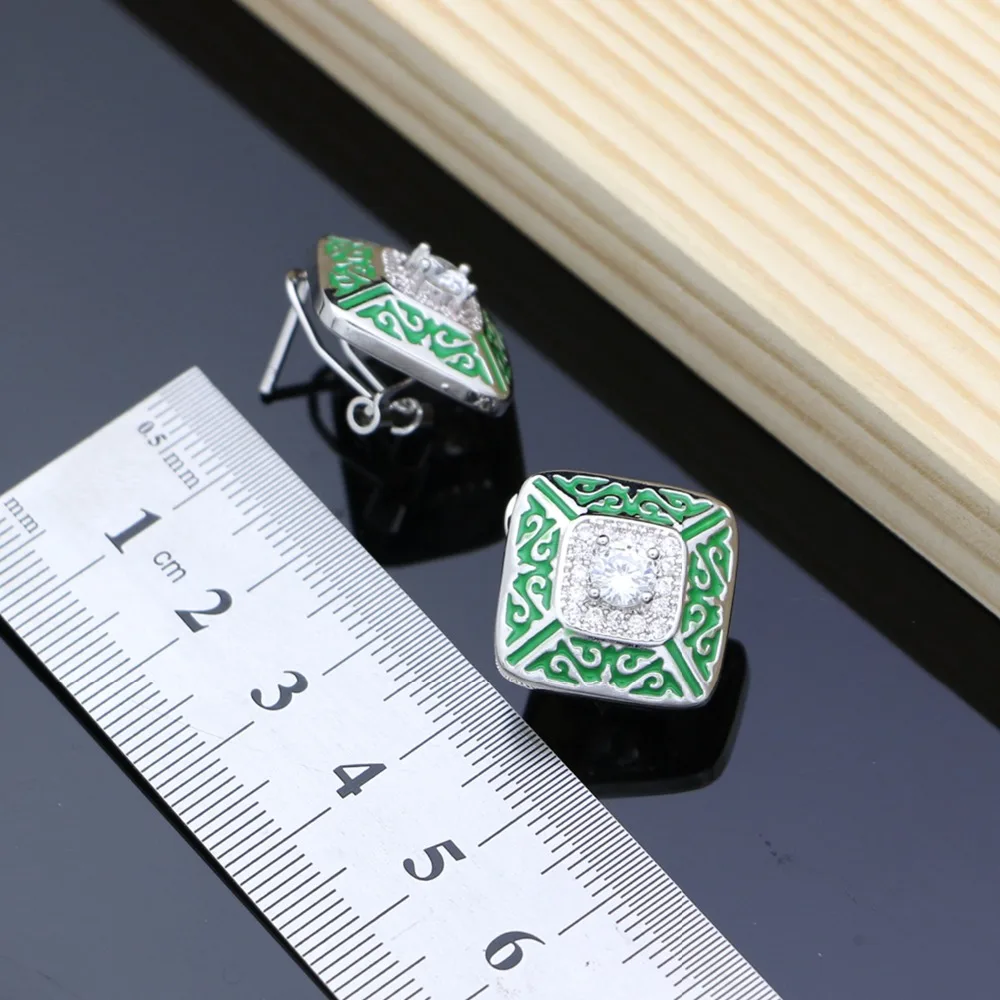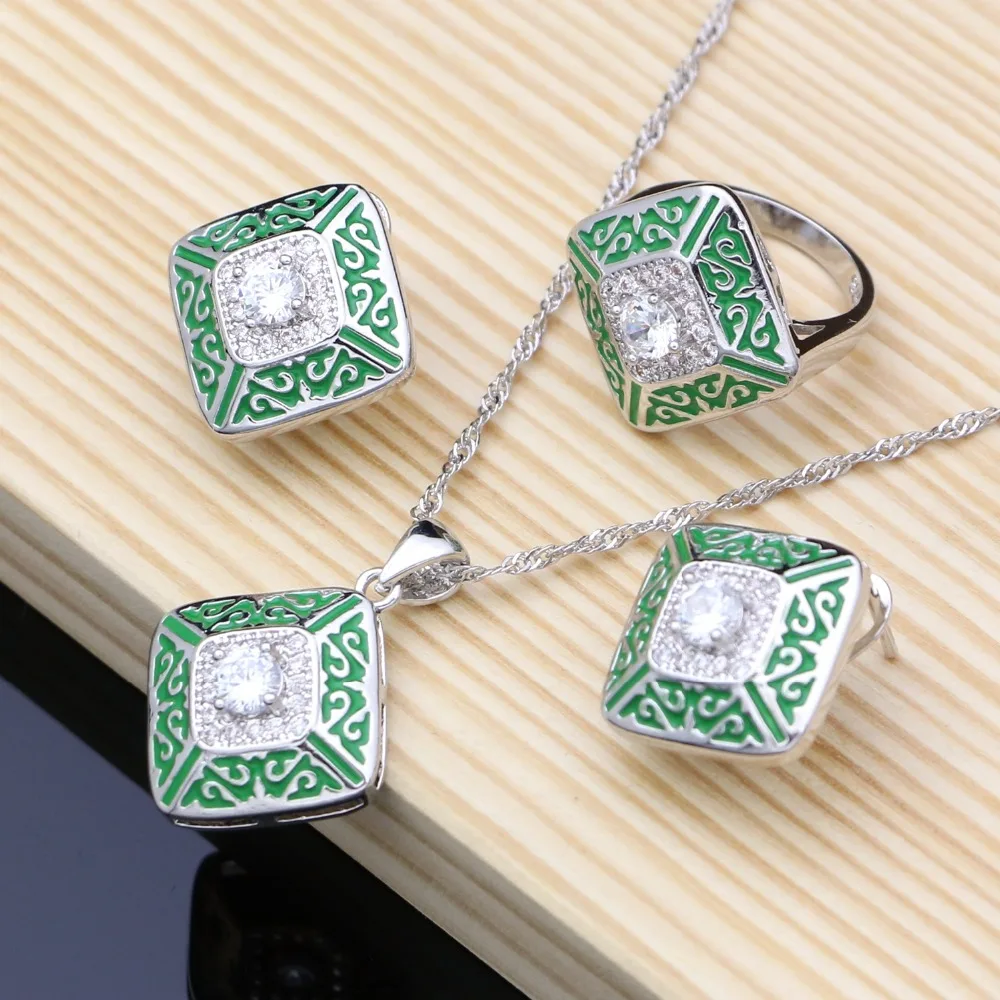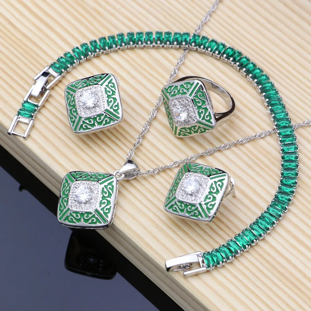 Special Offer Green Lucite White Zircon Silver 925 Bridal Costume Jewelry Sets For Women Earrings Pendant Ring Stones Bracelet Necklace Set Discount 37% Today!