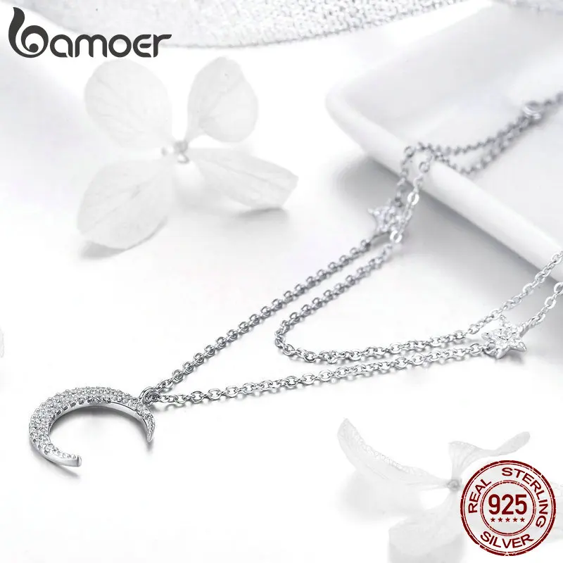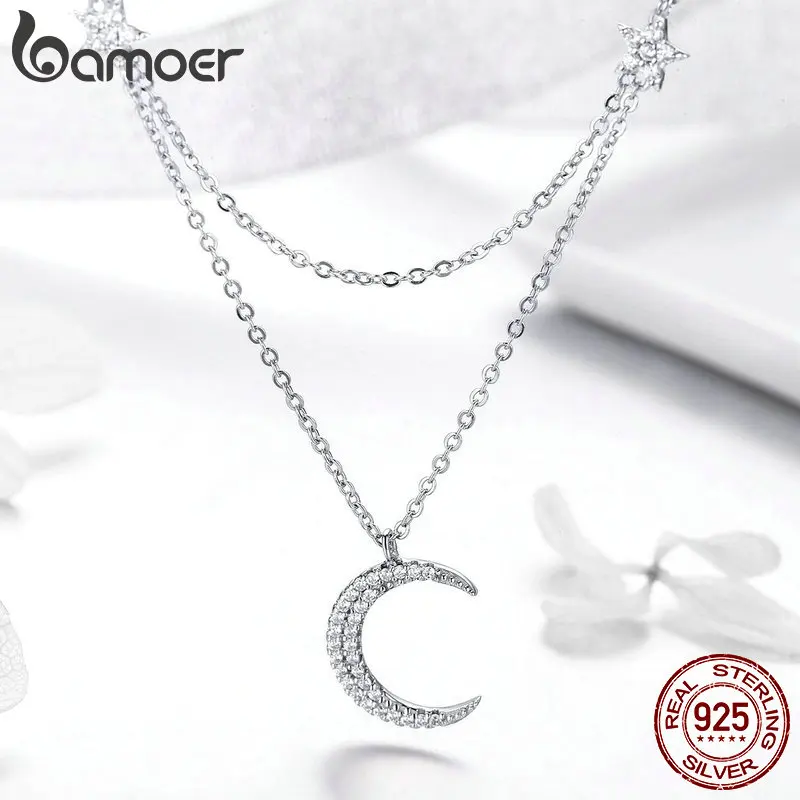Special Offer BAMOER Genuine 925 Sterling Silver Moon Star Double Layers Chain Pendants Necklaces for Women Sterling Silver Jewelry BSN038 Discount 30% Today!