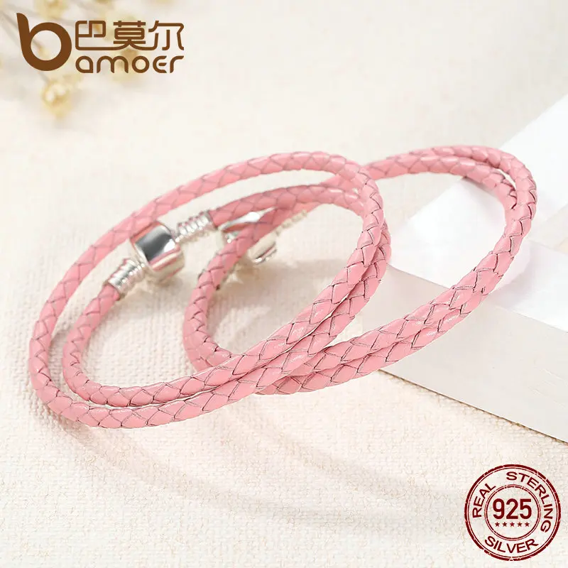 Special Offer BAMOER Genuine Long Double Pink Black Braided Leather Chain Women Bracelets with 925 Sterling Silver Snake Clasp PAS908 Discount 40% Today!