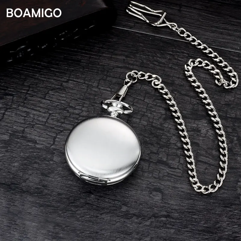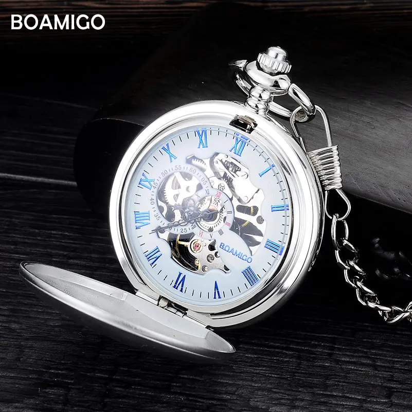 Best . (40% Off) Buy BOAMIGO brand FOB pocket watches fashion mechanical hand wind skeleton watches silver gift clock alloy case with chain Price Online.